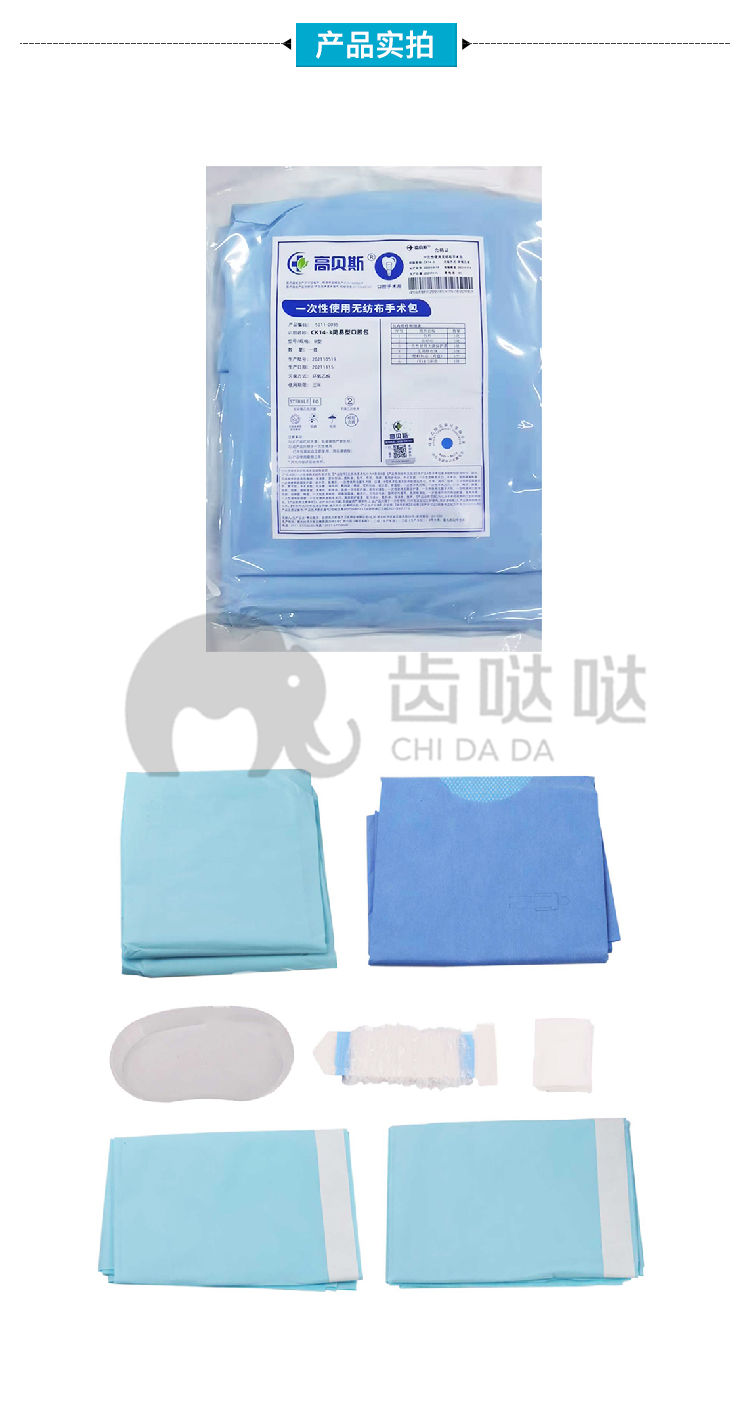 产品包含: 包布 100*160cm 1块 手术衣 L号 2件 治疗巾 60*80cm 2块 机头套 8*120cm 1块 敷料块 5*7cm-8p 5块 弯盘 1个 洞巾 120*180cm 1块